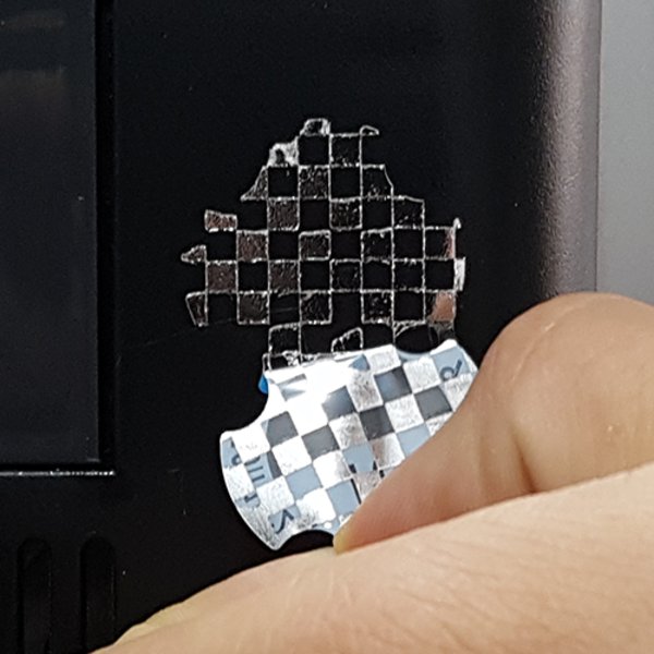 The M1183 tamper-evident label material features a permanent adhesive and a metallised topcoat. This type of polyester label leaves a checkerboard pattern on the surface upon removal, providing clear evidence that an attempt has been made to remove the label. Once removed, the label can no longer be reused.
